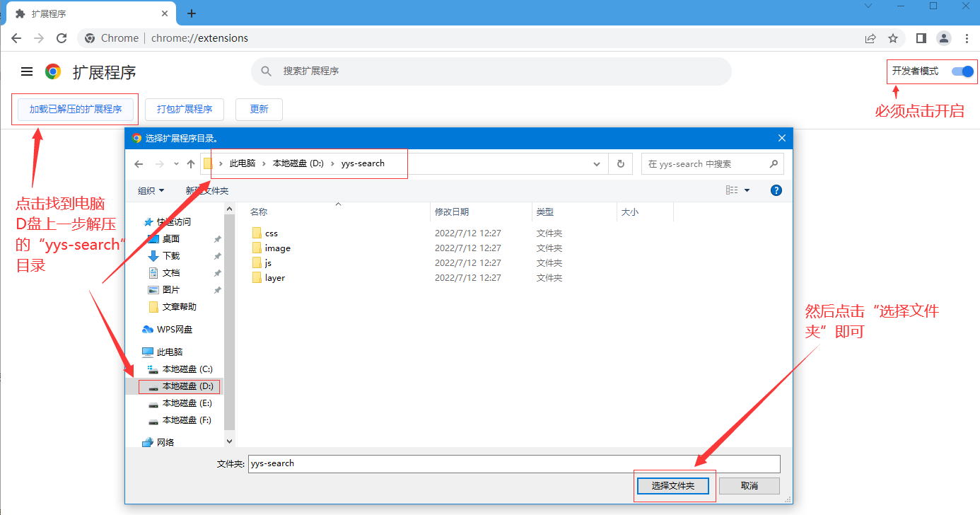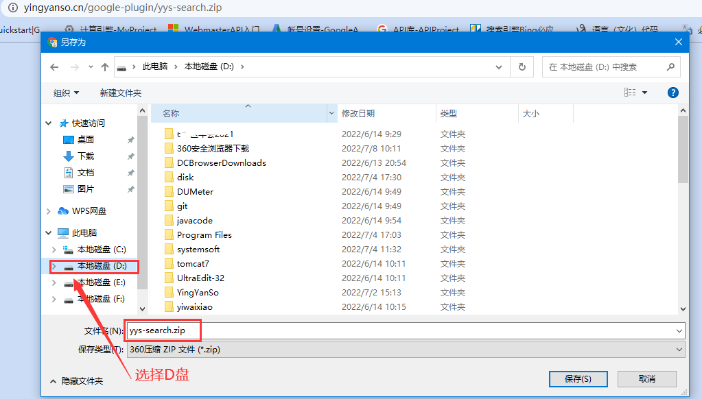 点击链接:https://www.yingyanso.com/google-plugin/yys-search.zip 将此软件包下载放到电脑的D盘,然后直接解压,即可在电脑D盘,看见一个名为“yys-search”文件夹。