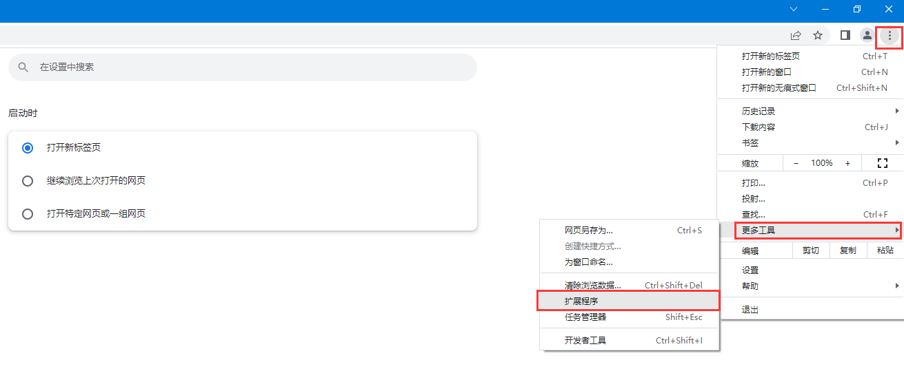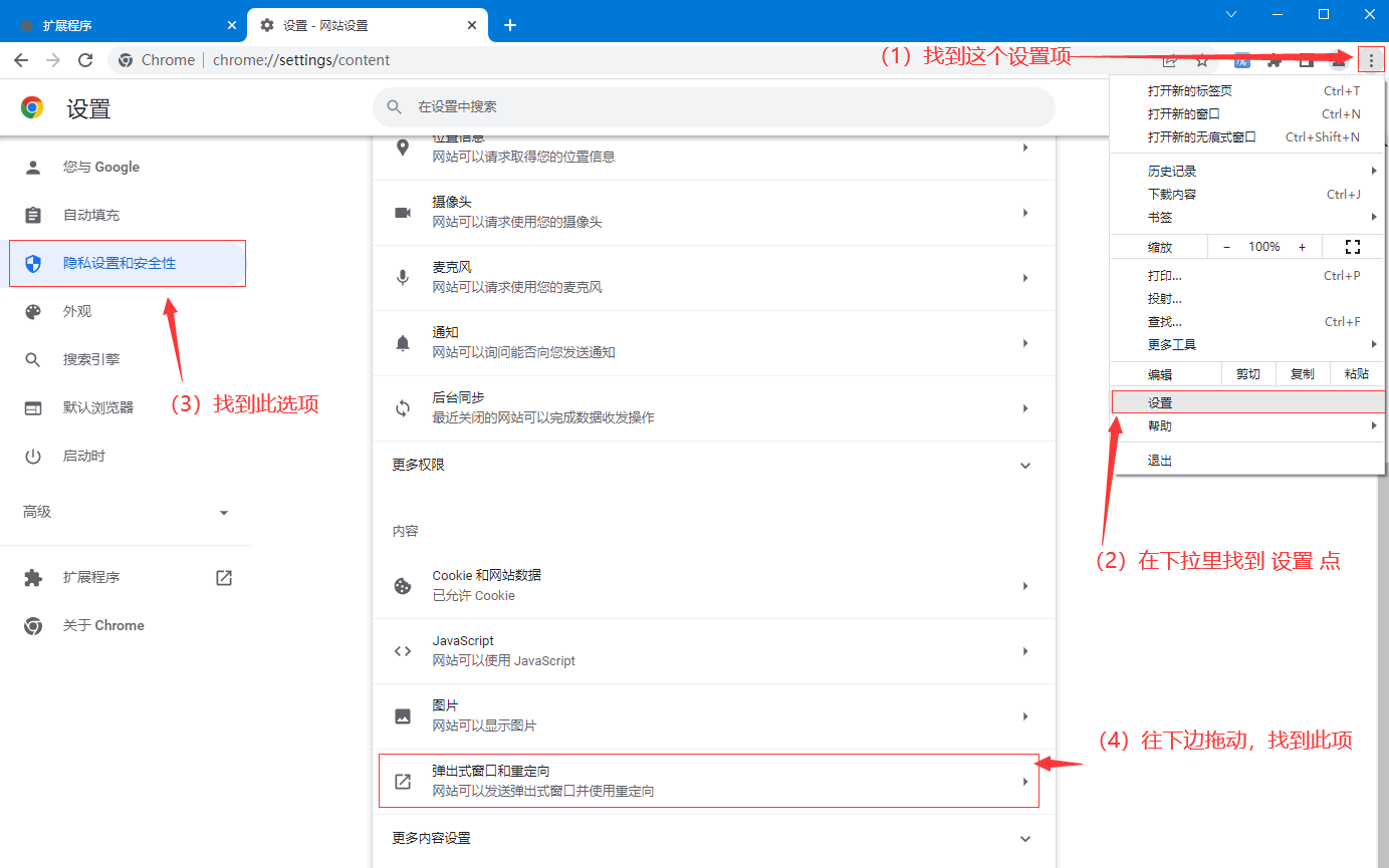 然后打开谷歌浏览器,按下图步骤进入安装与设置