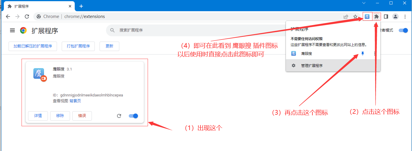 1、谷歌浏览器“鹰眼搜浏览器”插件安装方法: