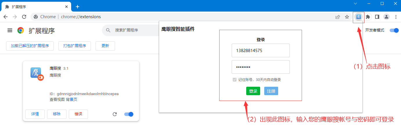 鹰眼搜3.0版全面启用在线方式搜索客户,不再需要安装桌面端软件,但必须需要安装一个浏览器插件来配合搜索客户,安装方法如下: