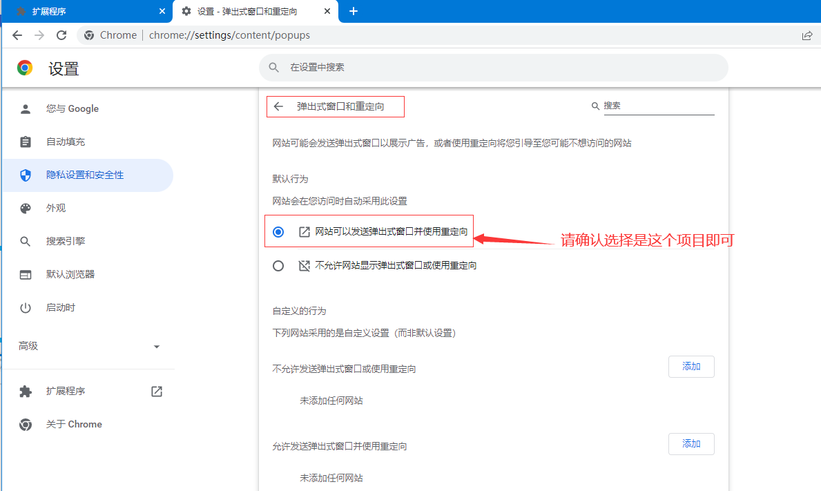 点击上图的“弹出式窗口和重定向”,看下图设置,一模一样